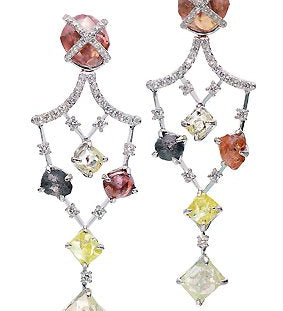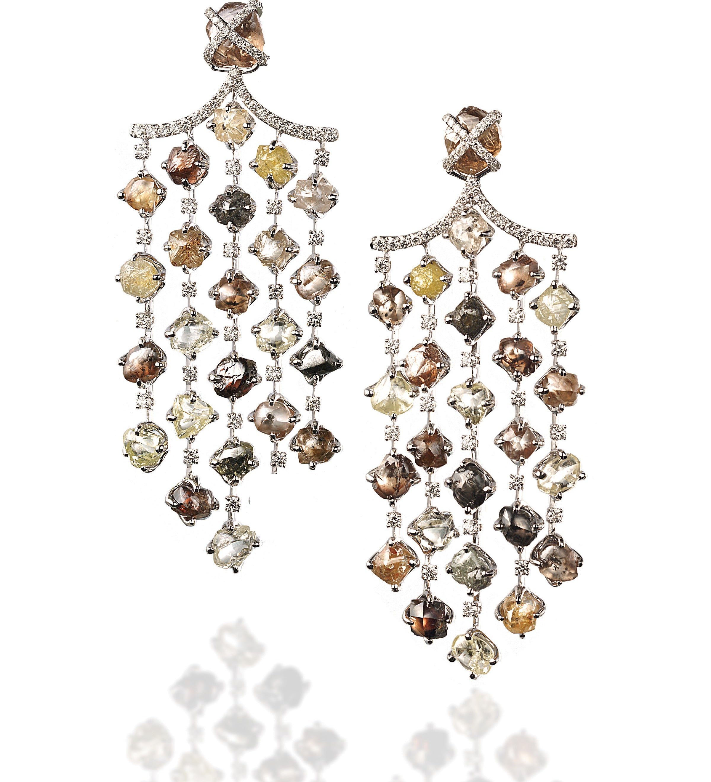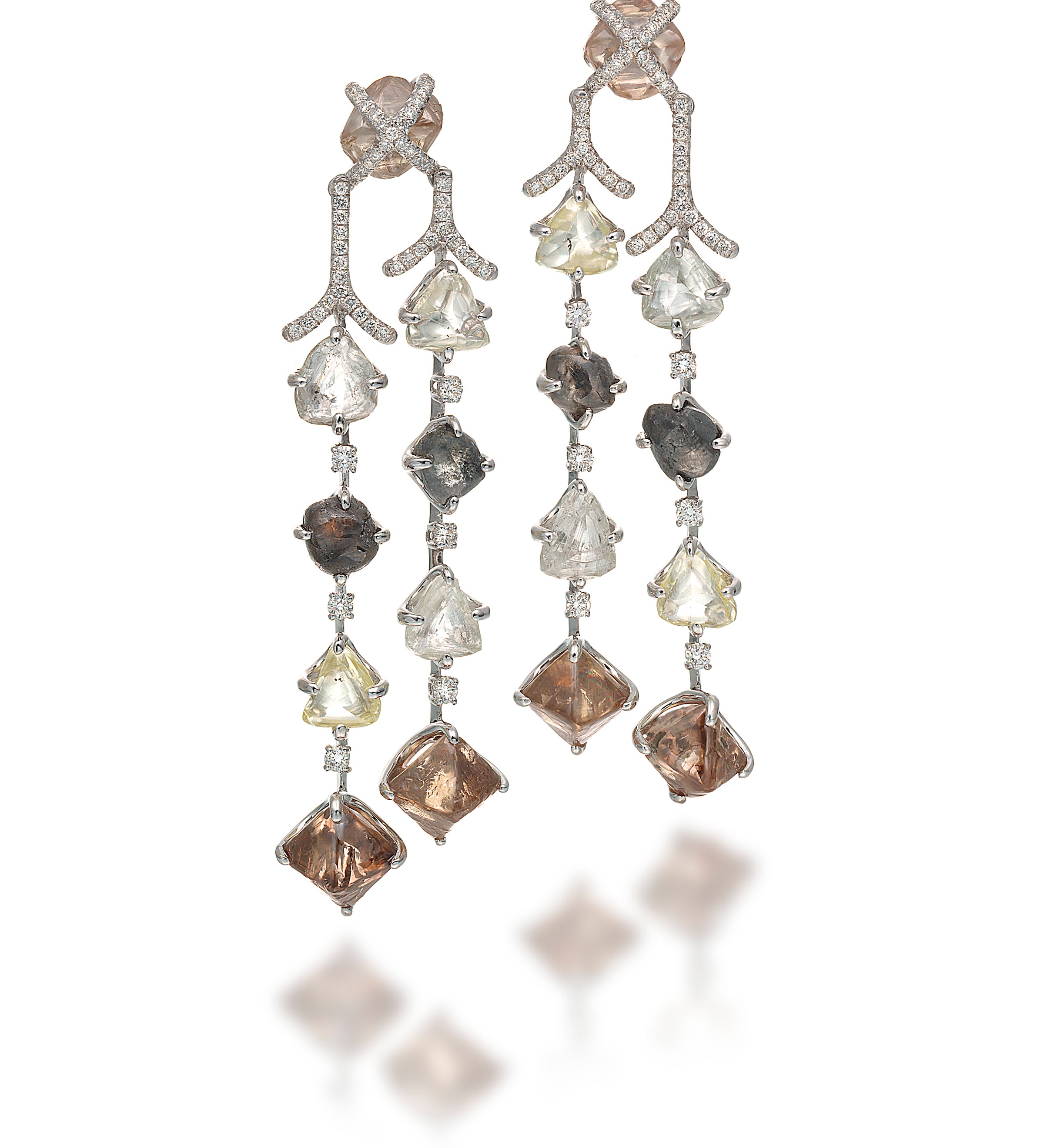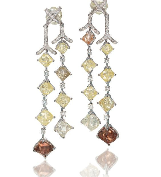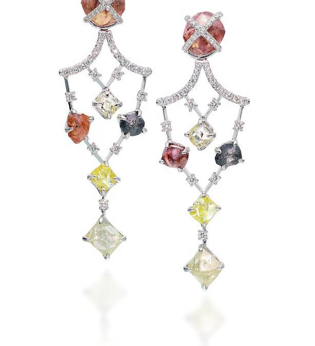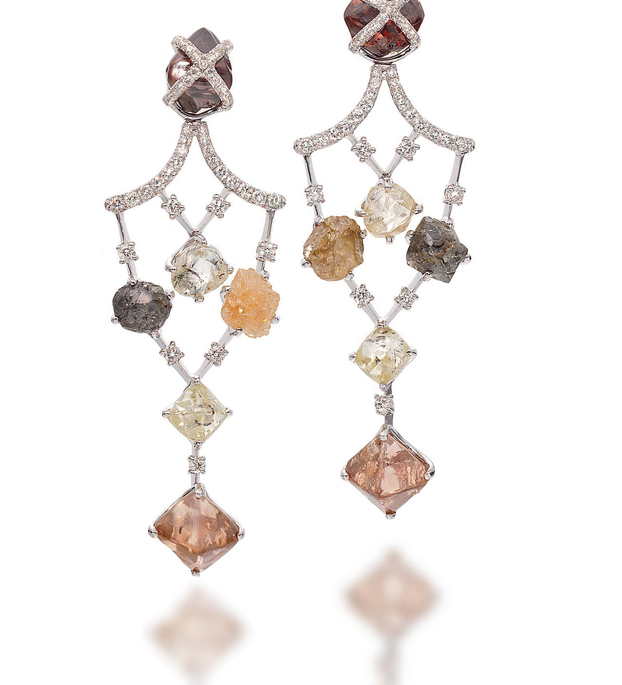 The RAW Earrings collection features an extraordinary array of Natural Rough Colored Diamonds ranging from soft pinks to electric yellows, each piece is hand-crafted in 18K white Yellow or Pink Gold.