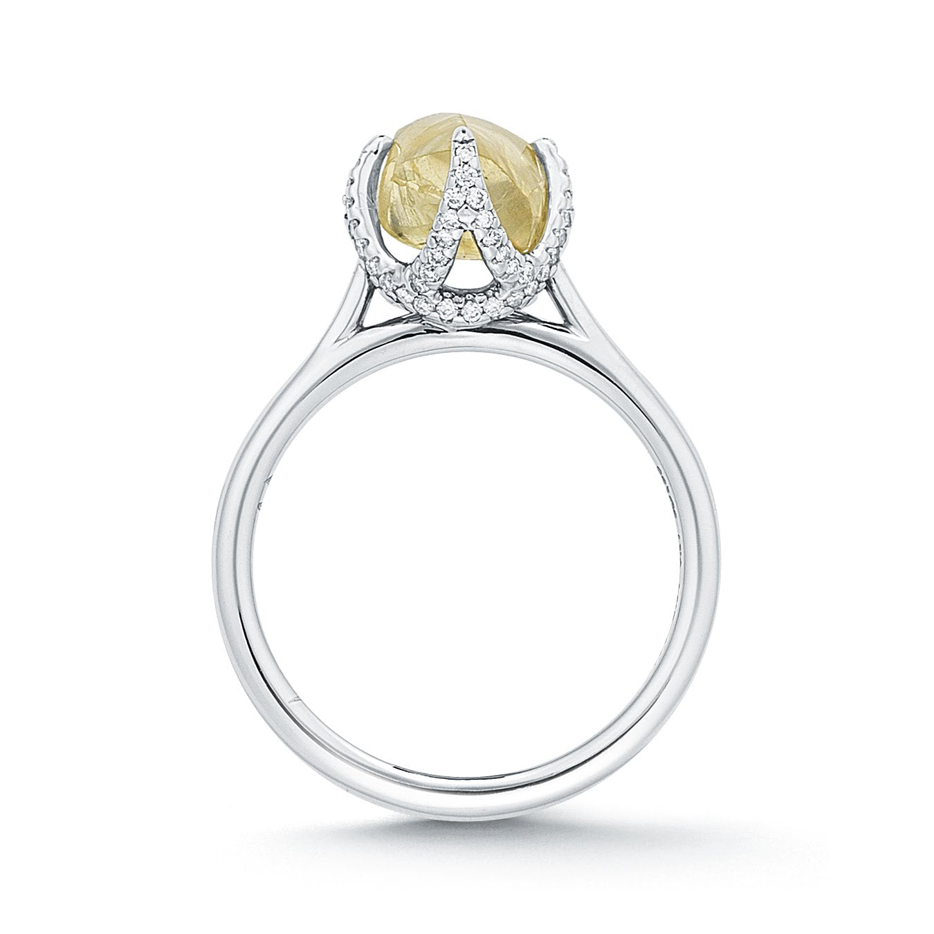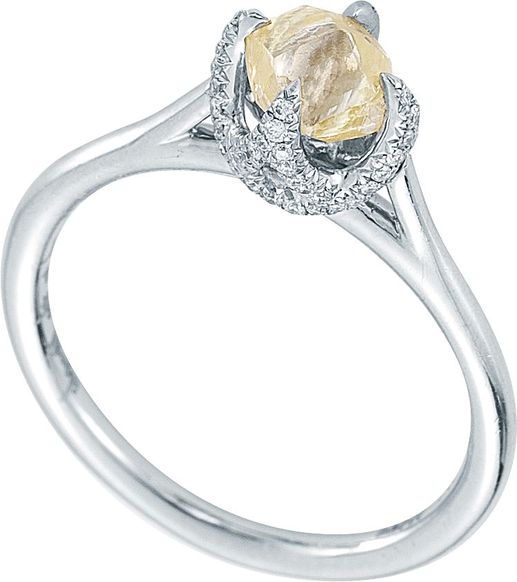 Custom Order - Only 21 Days to Get our Signature Ring featuring 1 Champagne Yellow Color Natural Rough Diamonds totaling 1.00ct - 2.00ct in Platinum and 0.10ct - 0.20ct Micro Pavé Diamonds. Signature is an architectural twist on the traditional pronged engagement ring. Unique branches adorned in micro pave diamonds nestle the rough diamond.