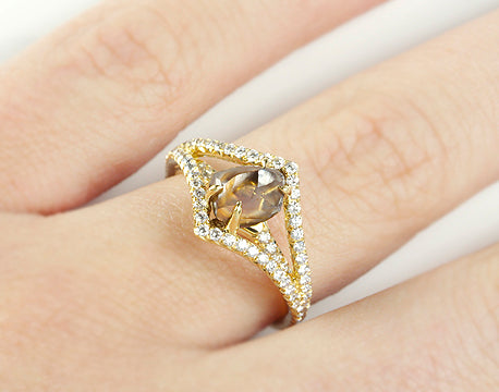 Custom Order - Only 21 Days to Get our beautiful, elegant, victorian solitaire ring inlaid with 1 Chocolate Brown Color Natural Rough Diamonds totaling 1.50ct  - 2.50ctin 18K Yellow Gold and 0.48ct Micro Pavé Diamonds.  The Victorian is reminiscent of the gilded age, known for glamour, style, and opulence. The vintage design of this ring transports the wearer to a time of grandeur.